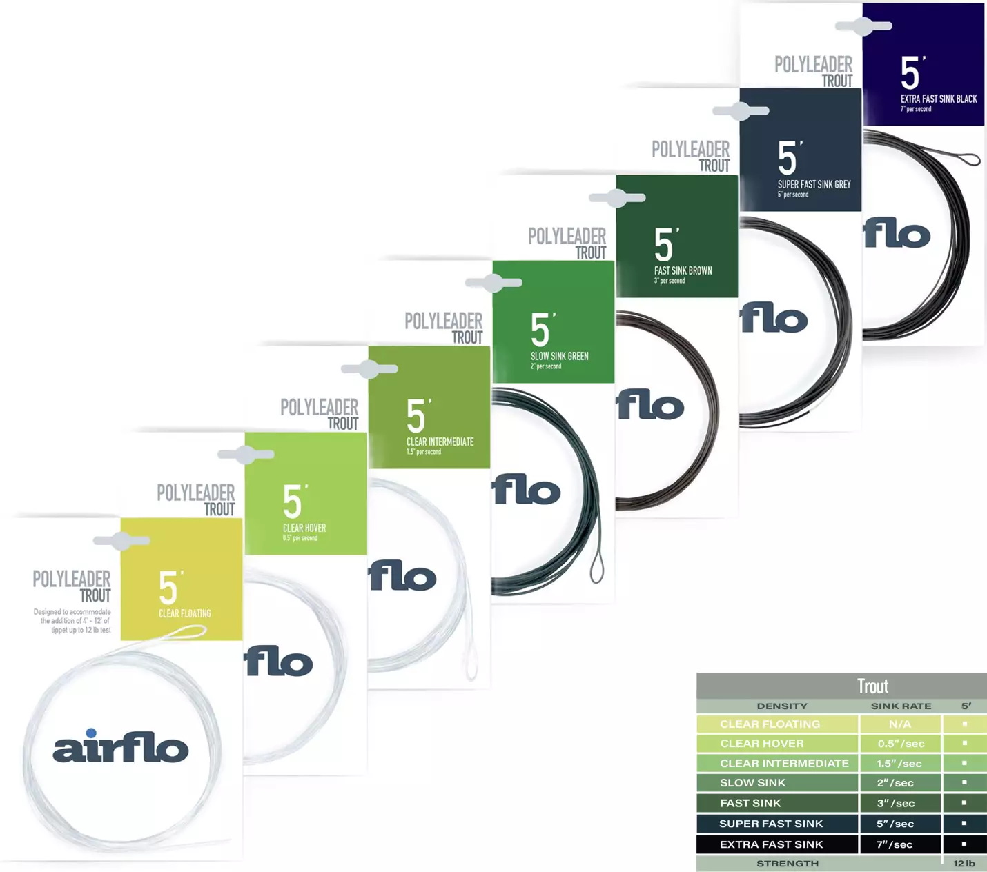 Der Airflo Polyleader 5' Trout ist eine vielseitige und benutzerfreundliche Vorfachschnur, die dabei hilft, den Köder kontrolliert in allen Angelsituationen zu präsentieren. Die verfügbaren verschiedenen Sinkgeschwindigkeitsoptionen (7 Dichten) ermöglichen das Angeln in der gesamten Wassersäule – von der Oberfläche bis zu tieferen Einsätzen sowohl im Fluss als auch im See.