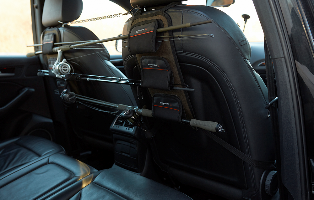 Äußerst praktischer Angelrutenhalter, der an der Rückenlehne des Autositzes befestigt wird und Platz für bis zu drei montierte Angelruten bietet. Enthält auch einen Spannschloss mit Haken, der zwischen den Halterungen eingeklemmt werden kann, sodass die Ruten auch längs verstaut werden können.