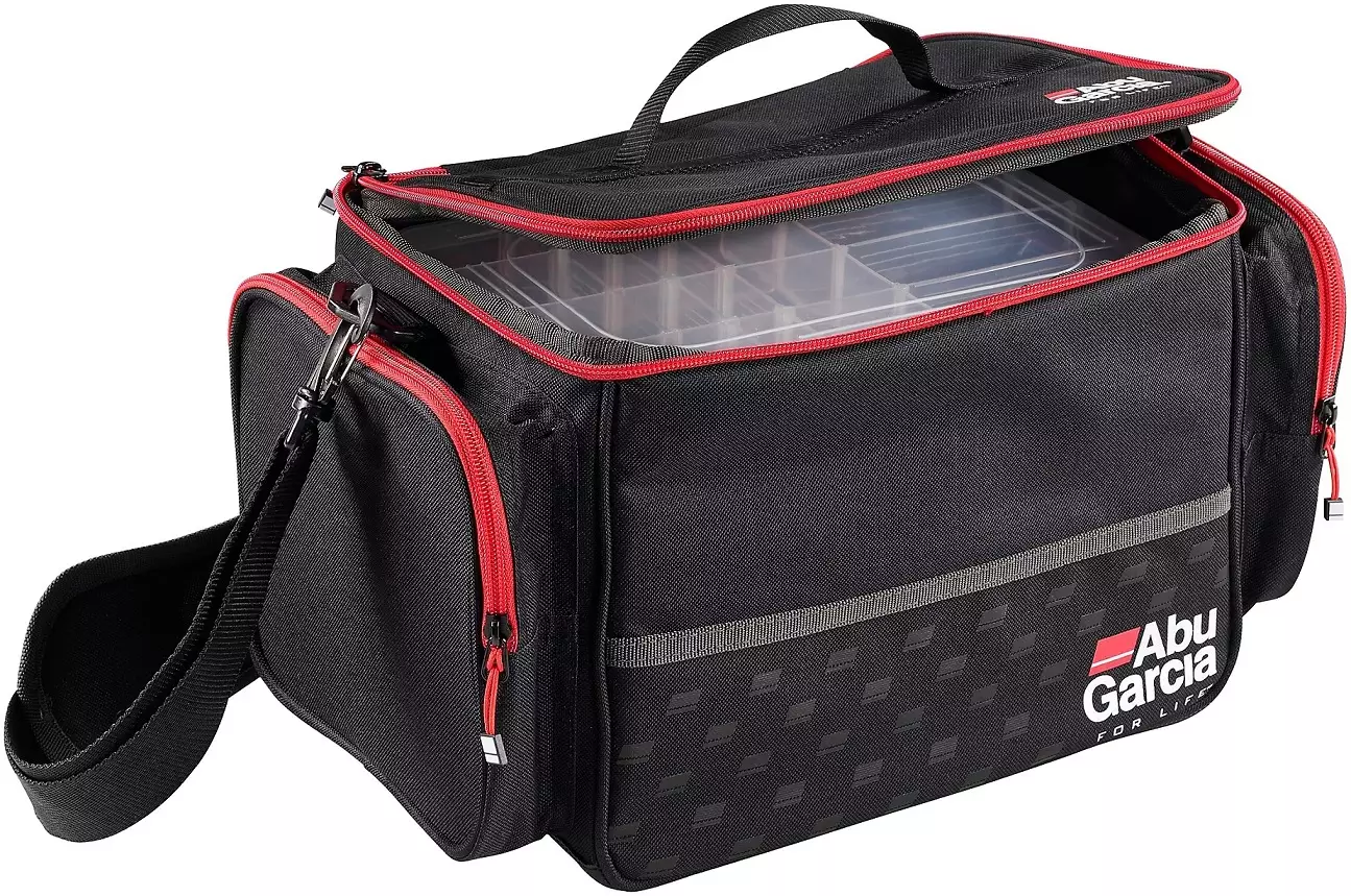 Abu Garcia Schultertasche ist eine mittelgroße Ausrüstungstasche, die 3 leere Angelköderboxen (mittlere Größe) enthält. Sie besitzt einen verstellbaren Schultergurt sowie einen Tragegriff.
