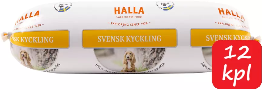 Halla Svensk Kyckling ist schmackhaftes und nahrhaftes Alleinfutter für erwachsene Hunde mit normalem Aktivitätslevel. Es wird in Schweden hergestellt und enthält Fleisch, Innereien und Gemüse von schwedischen Farmen. Das Futter ist von Natur aus sehr gut verdaulich und magenfreundlich.
