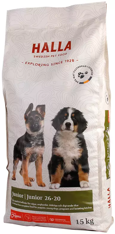 Halla Junior ist ein hochwertiges schwedisches vollwertiges Futter für Welpen und junge Hunde, das entwickelt wurde, um gesundes Wachstum, starke Knochen und eine ausgewogene Entwicklung in der entscheidenden Phase des Lebens zu unterstützen.