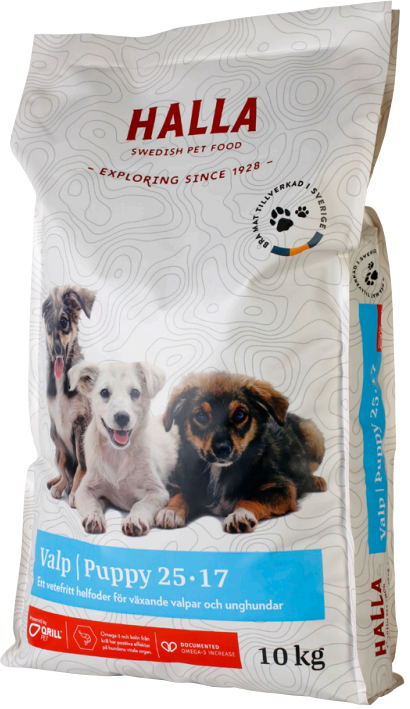 Halla Valp wird aus kontrollierten schwedischen Rohstoffen hergestellt und erfüllt alle ernährungsphysiologischen Bedürfnisse wachsender Hunde.
