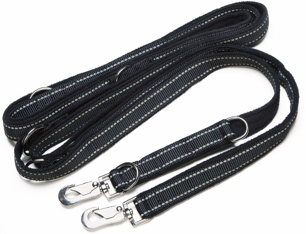 Die Multifunktionsleine kann entsprechend angepasst werden; sie kann durch Befestigen des zweiten Karabiners an den Ringen der Leine je nach Bedarf verlängert oder verkürzt werden. Dank der zwei Karabiner kann sie auch als Teilung für das gleichzeitige Ausführen von zwei Hunden verwendet werden.