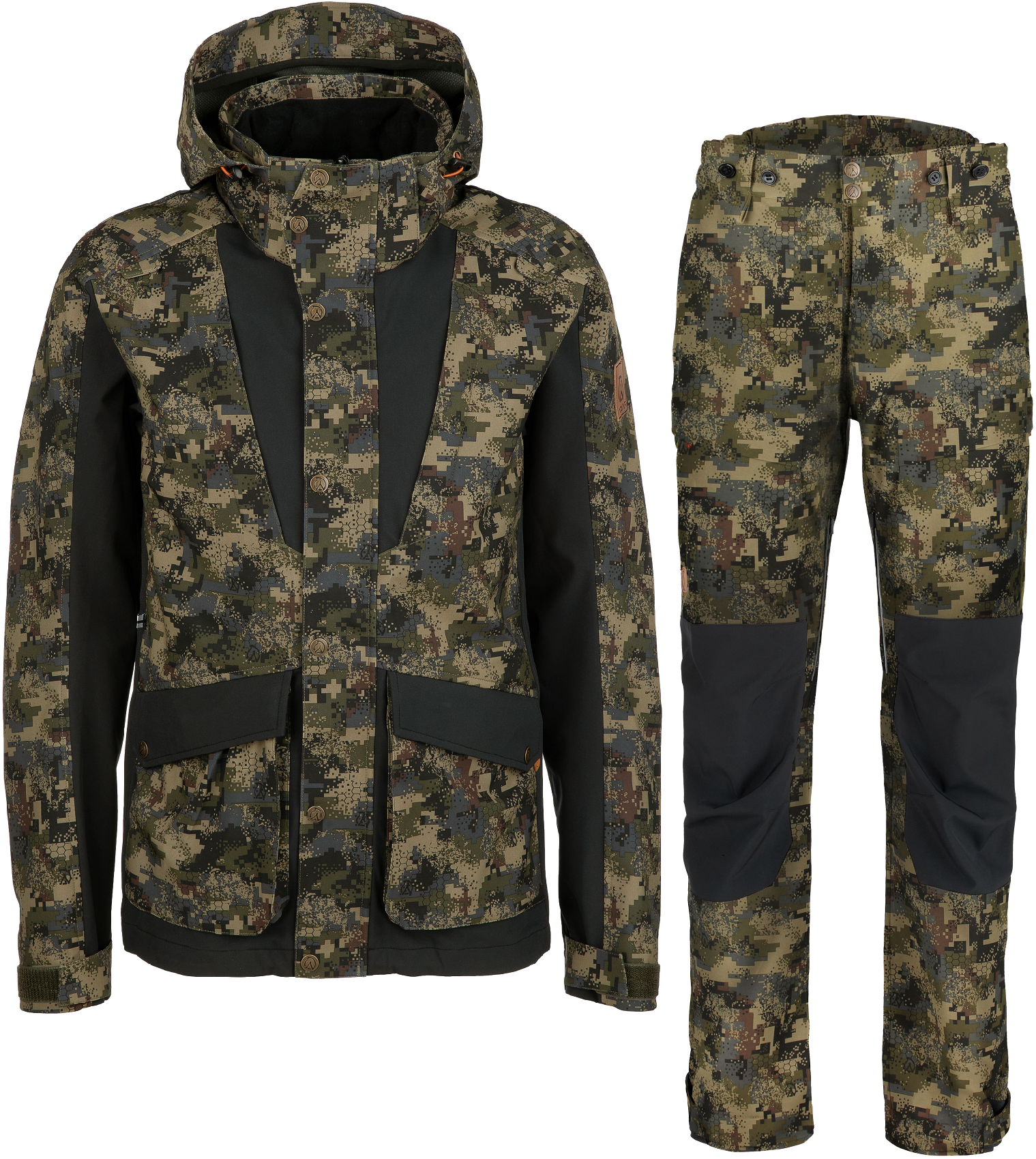 Suohtas 2.0 ist atmungsaktiv und leicht, was für den Jäger hohen Komfort bietet. Die Nähte sind nicht komplett wasserdicht, doch die Konstruktion hält auch starkem Regen stand. Bei aktiven Bewegungen können die Belüftungsöffnungen an den Seiten der Jacke und Hose für zusätzliche Belüftung geöffnet werden. Dank des verstellbaren Saums und der Manschetten kann die Passform der Jacke je nach Situation angepasst werden.