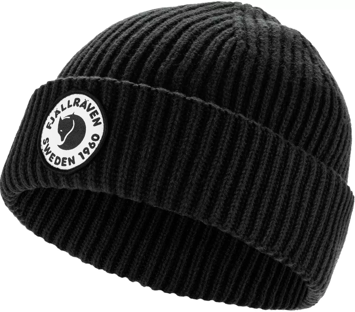Fjällräven 1960 Lite Logo Mütze, Schwarz 550 - SchwarzWeiche, ribbelige Mütze, die aus einer Bio-Baumwoll- und nachverfolgbaren Merinowollmischung hergestellt wird. Leichteres Modell der... Mehr lesen