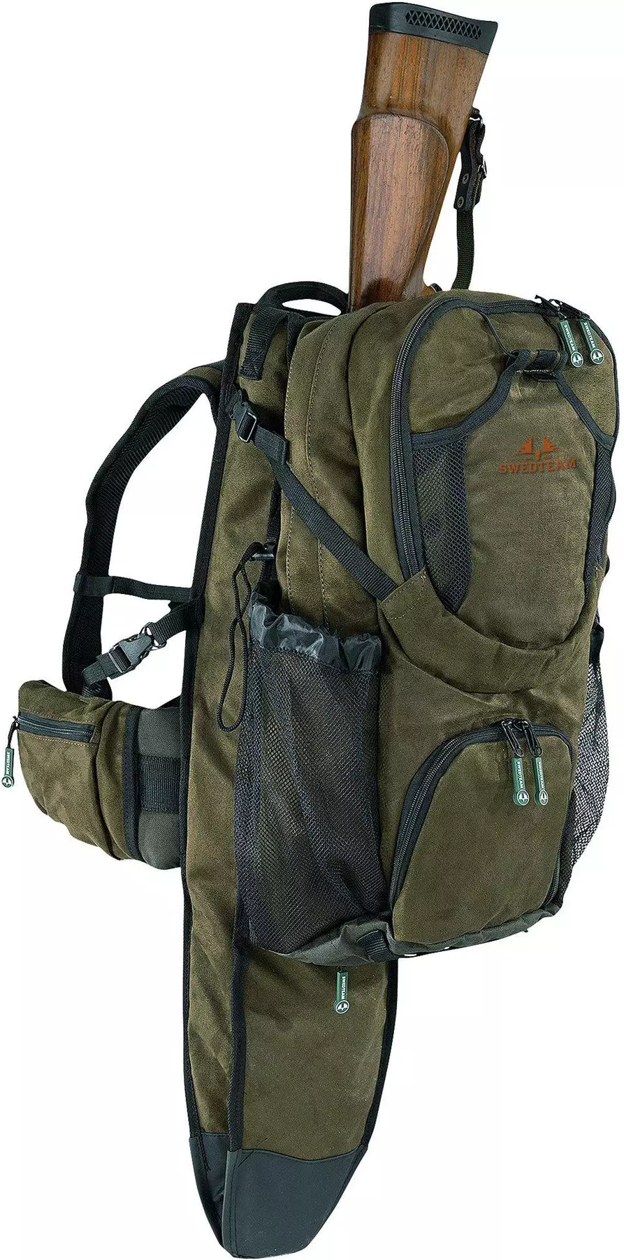 Der Rucksack verfügt über einen integrierten Waffentransportbereich, der speziell für den sicheren Transport von Gewehren oder Flinten entwickelt wurde. Mehrere Taschen und Netzinnentaschen erleichtern die Organisation der Ausrüstung, und das Gesamtvolumen von 46 Litern stellt ausreichend Platz für sowohl die Waffe als auch weitere Ausrüstungsgegenstände sicher. Das Waffengehäuse hat ein Volumen von 9 Litern, was den unauffälligen und stabilen Transport der Waffe ermöglicht.