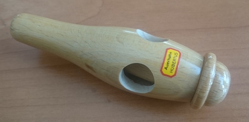 Holzpfeife, mit der du das 'Suhina' Geräusch des Auerhuhns erzeugen kannst.