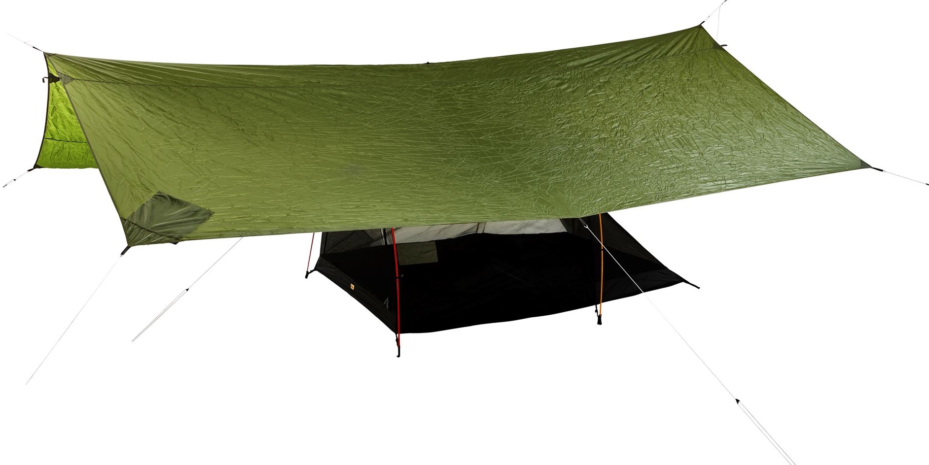 Große Schutzhülle aus leichtem und sehr starkem 40D TripleRip-Nylon. Die Abdeckung bietet flexible zusätzlichen Platz außerhalb des Zeltes. Sie kann auch alleine als leichter und tragbarer Schutz gegen Wind und Regen verwendet werden. Perfektes Dach für Innencamping oder Netzinnencamping, die separat aufgestellt werden können. Acht verstellbare Dyneema-Leinen halten die Abdeckung straff. Maße 3,5 x 4,5 Meter.