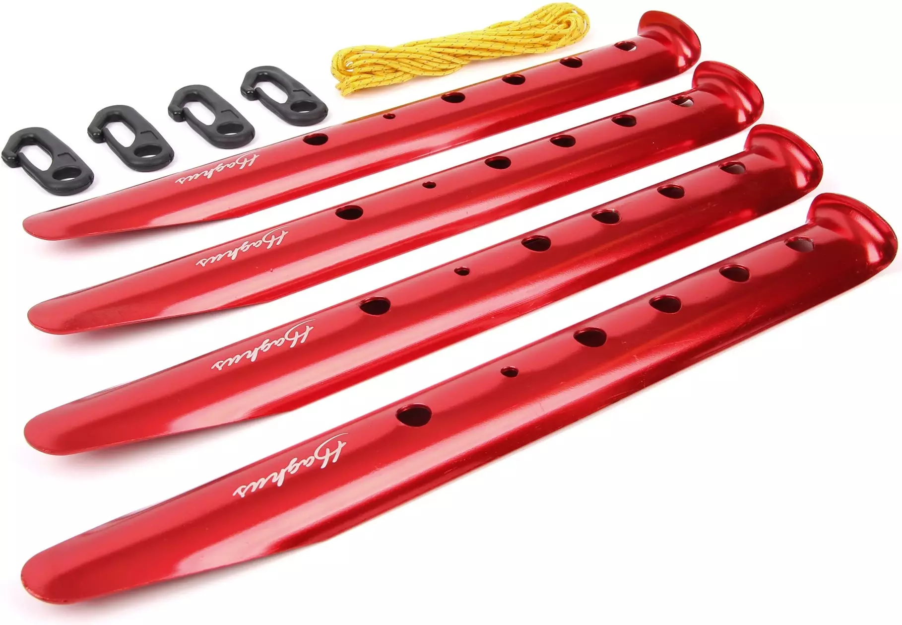 Die Zeltkeile werden zusammen mit Schnüren und Schnellhaken geliefert, die die Verwendung der Zeltkeile vereinfachen.